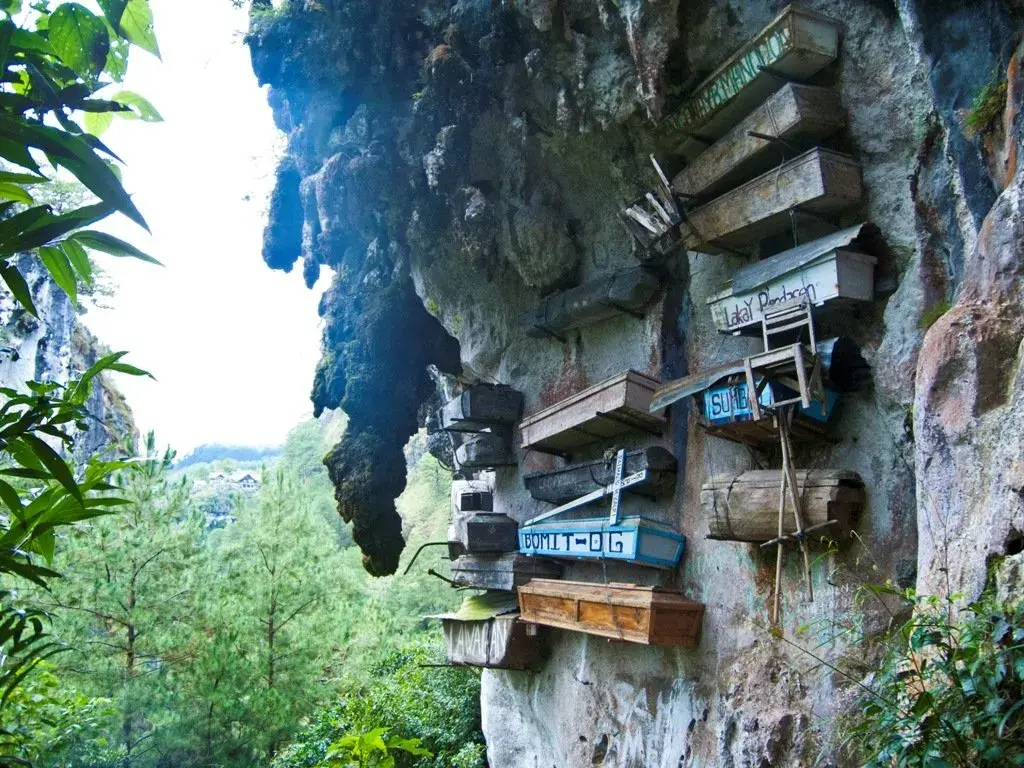 Cuando la persona muere, es colocada en el ataúd en posición fetal y en lugar de enterrarla, las tumbas están suspendidas en un acantilado, un féretro encima del otro. Originalmente, esto se hacía para evitar que los animales llegaran a los cuerpos y los devoraran, pero con el tiempo se ha convertido en una macabra tradición.