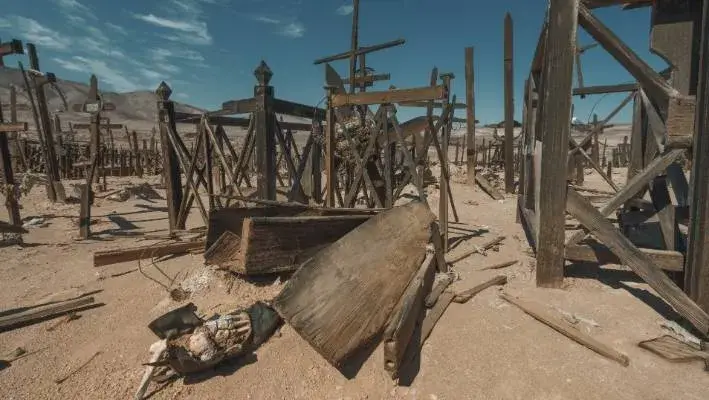 El patio del cementerio, tiene una vista espeluznante; tumbas abiertas, huesos expuestos y cadáveres es lo único que ofrece este páramo. Estos centros de explotación estaban en pleno desierto y como no existía la costumbre de trabajar por turnos, los trabajadores y obreros se mudaban a vivir cerca de la zona.