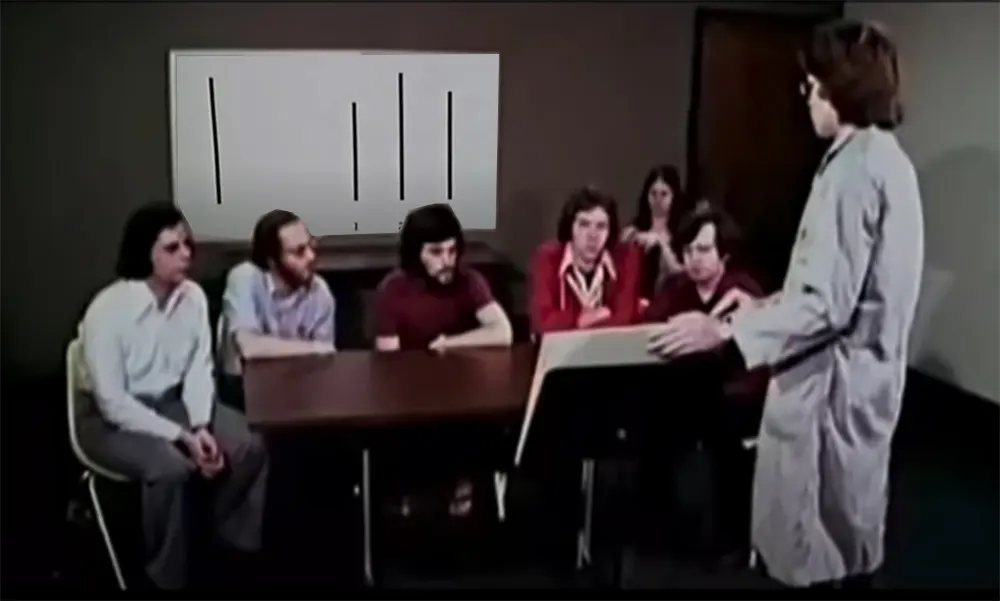 En la década de 1950, el psicólogo Solomon Asch llevó a cabo un experimento en el cual los participantes estaban en una sala donde se les mostraba una línea vertical. La verdad es que, sin que lo supieran, la mayoría de los participantes eran cómplices del experimentador y deliberadamente daban respuestas incorrectas en la mitad de las ocasiones.