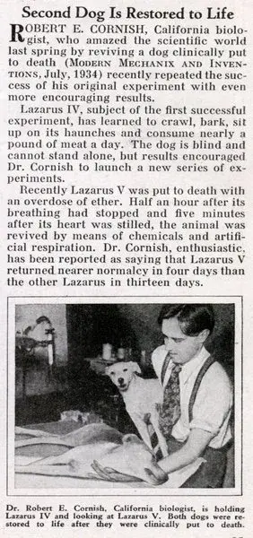 De estos cinco animales, Cornish solo logro revivir a Lázaro IV y V, muertos clínicamente el 22 de mayo de 1934 y en 1935.